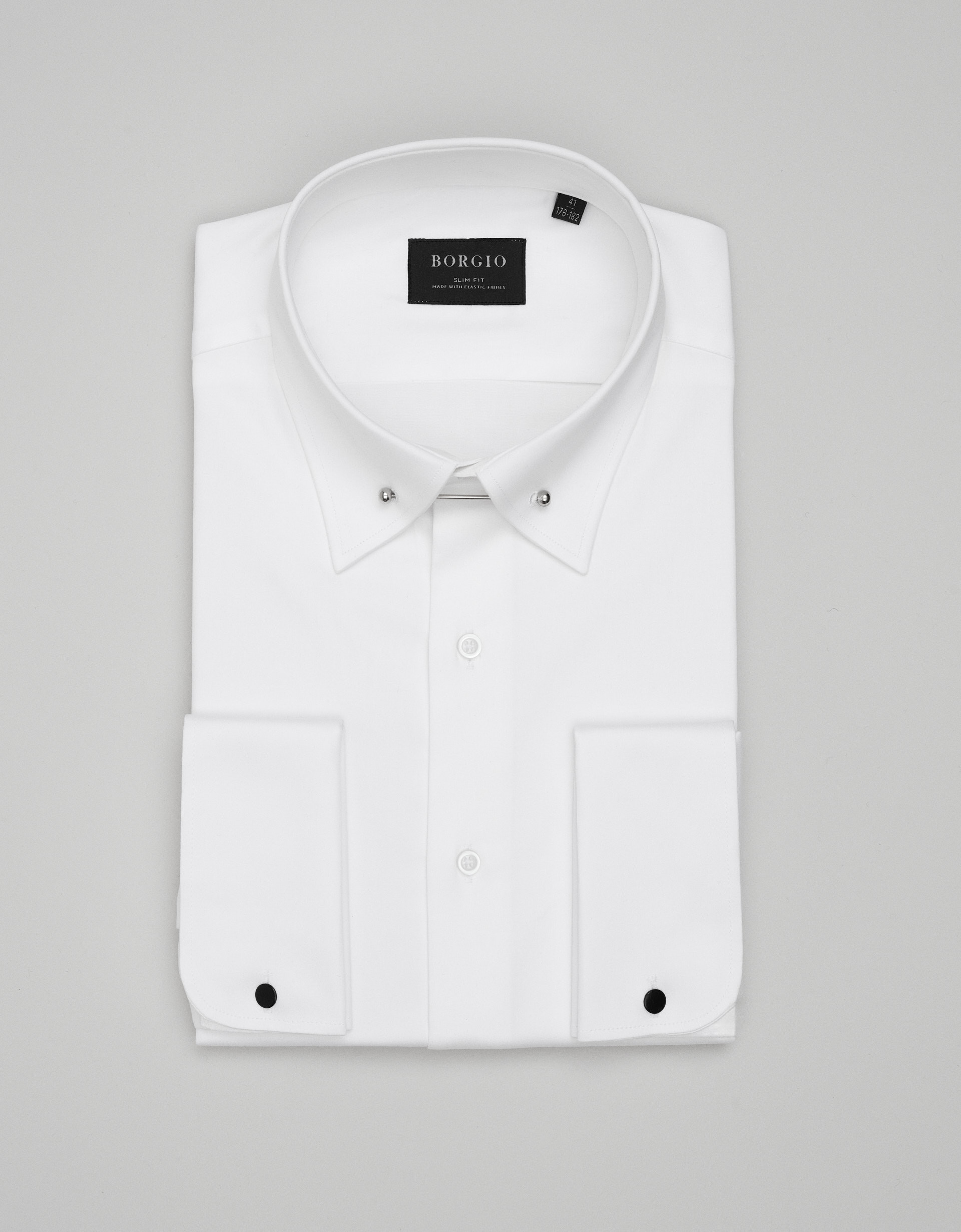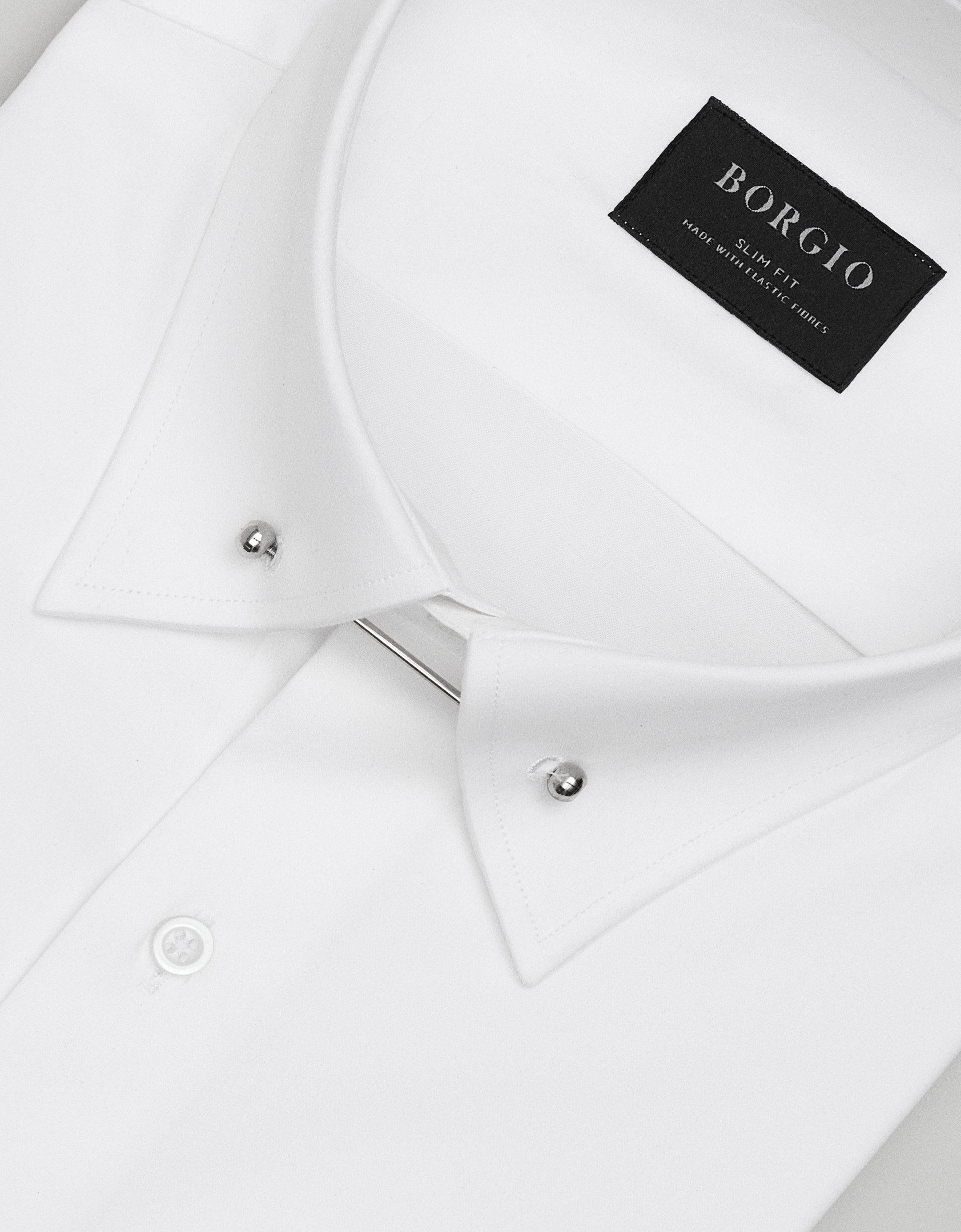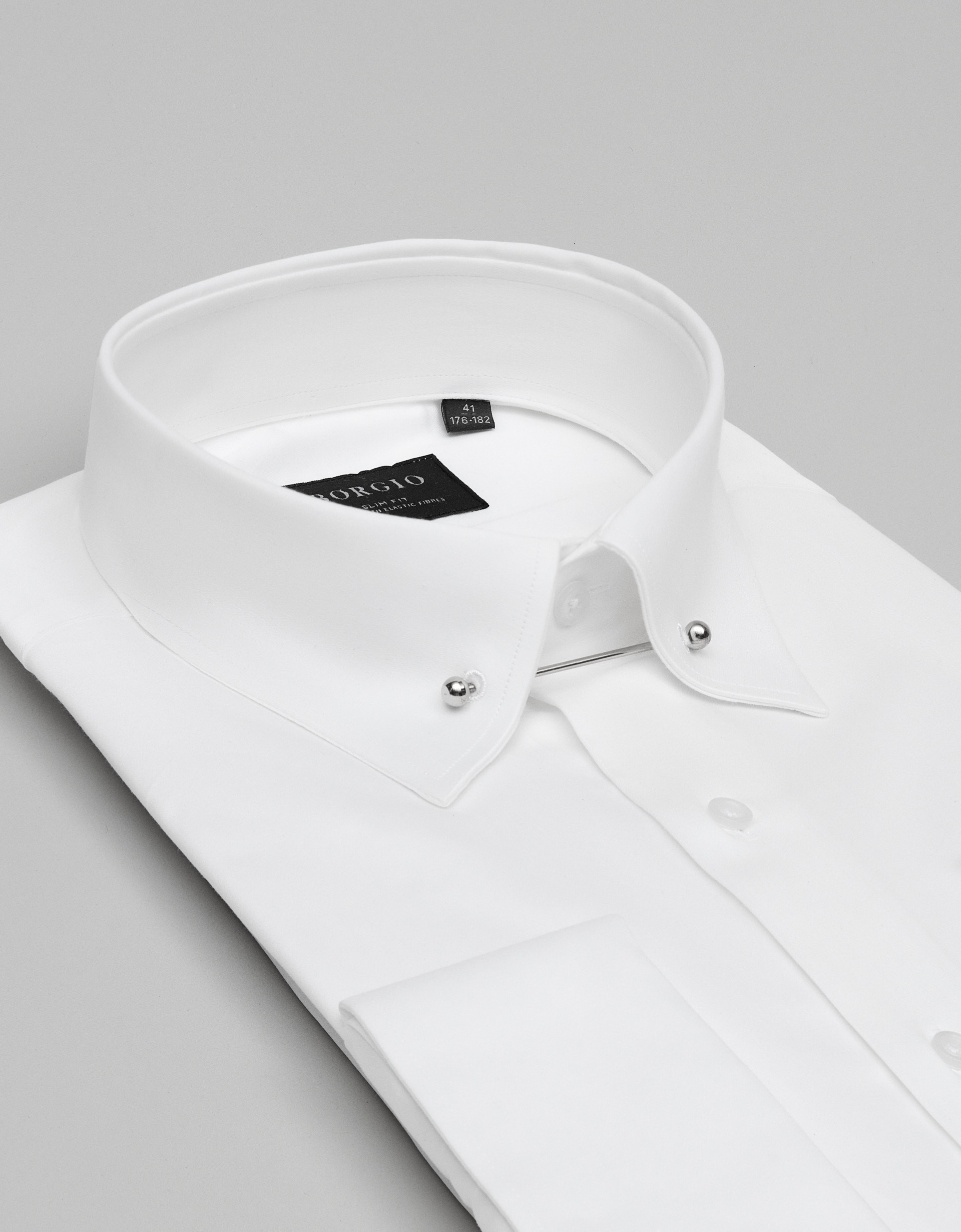 Model wyróżnia kołnierzyk pin collar, spięty srebrnym pinem, który subtelnie unosi węzeł krawata i dodaje całości wyrafinowanego, klasycznego charakteru. Koszulę uzupełniają mankiety na spinkę, podkreślające jej elegancki, wieczorowy profil. Gładka faktura tkaniny oraz czysta, biała kolorystyka nadają jej ponadczasowego stylu.