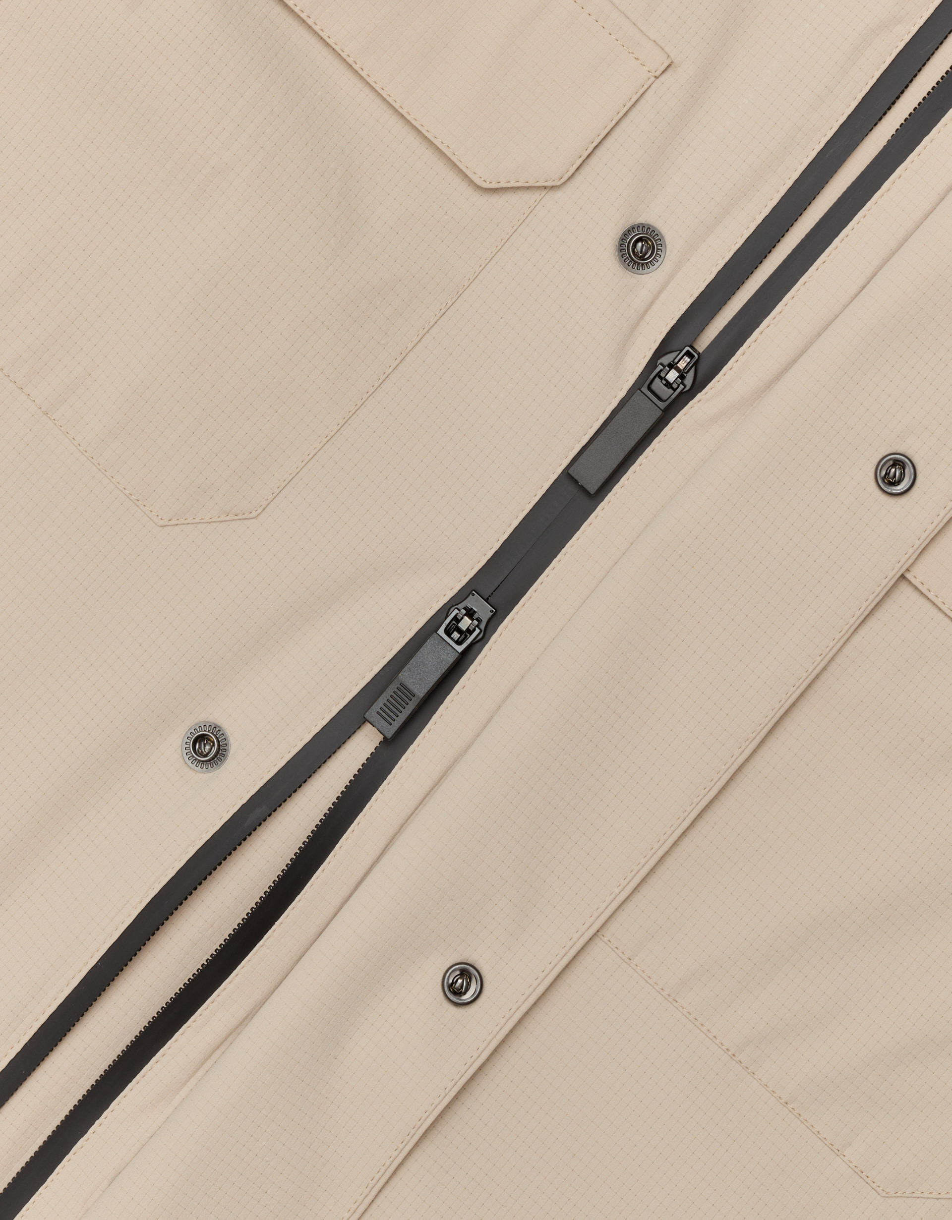 Model posiada dwustronny zamek zabezpieczony przed wilgocią, ukryty pod elegancką plisą, oraz cztery funkcjonalne kieszenie zapinane na napy, co nadaje kurtce swobodniejszego, a zarazem technologicznego stylu. Dopracowane detale, takie jak gumowy, wytrzymały wieszak, podkreślają wysoką jakość wykonania i nowoczesny design projektu.