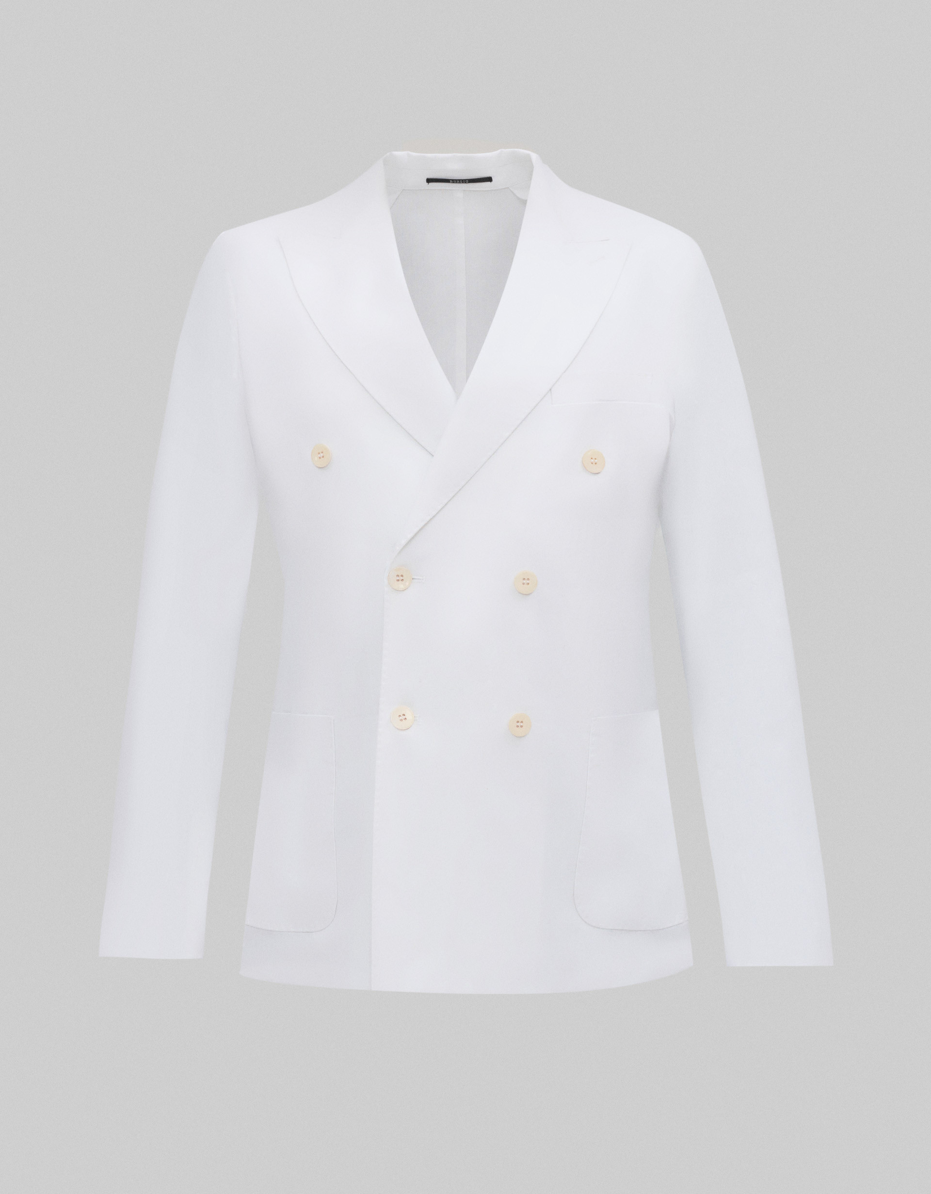 Model posiada zamknięte klapy, dwurzędowe zapięcie na guziki oraz nakładane kieszenie, co nadaje marynarce swobodniejszego, włoskiego stylu przy zachowaniu eleganckiej linii. Lekka konstrukcja bez pełnej podszewki zwiększa cyrkulację powietrza, czyniąc produkt idealnym wyborem na upalne dni.