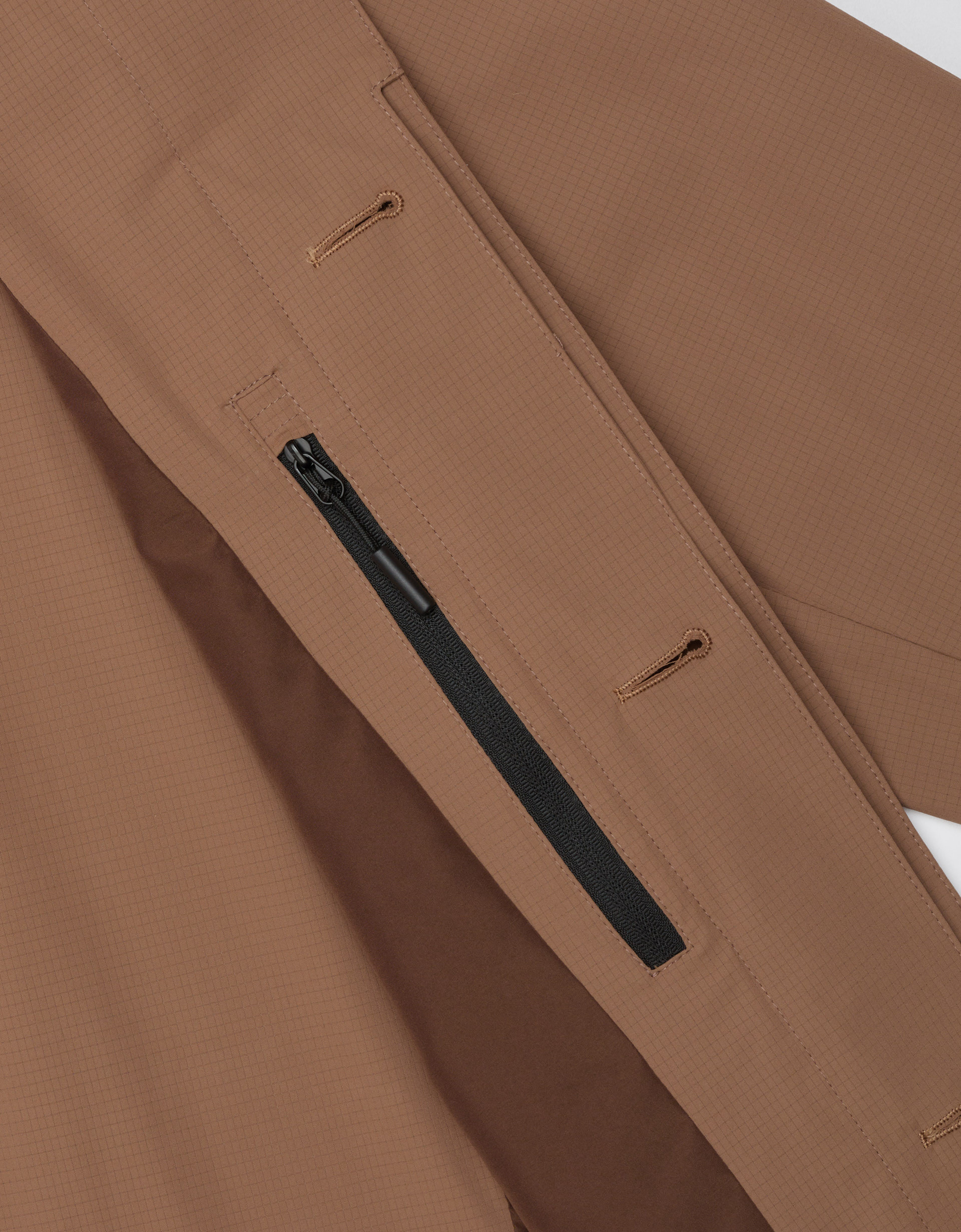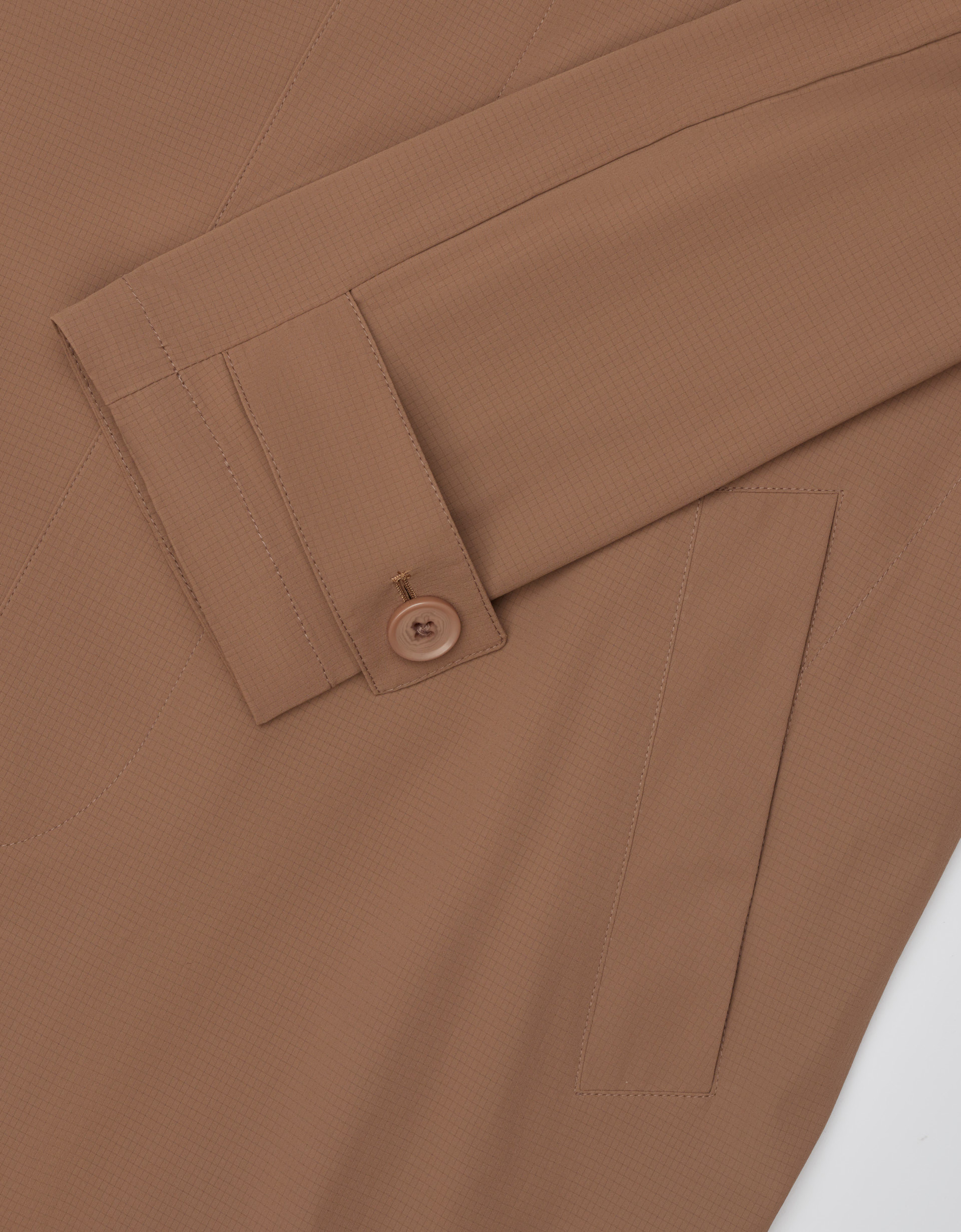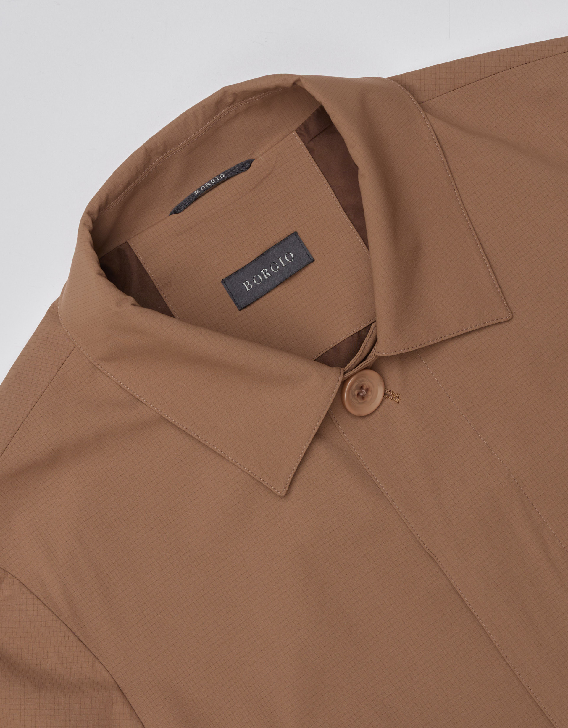 Benevento BR to brązowy płaszcz o fasonie car coat, wykonany z technicznej, przepuszczającej powietrze tkaniny o subtelnej strukturze. Nowoczesna interpretacja klasycznego kroju w literę A, wywodzącego się z początku XX wieku, nadaje projektowi z kolekcji SS’26 unikalnego, historycznego sznytu w odświeżonym wydaniu.