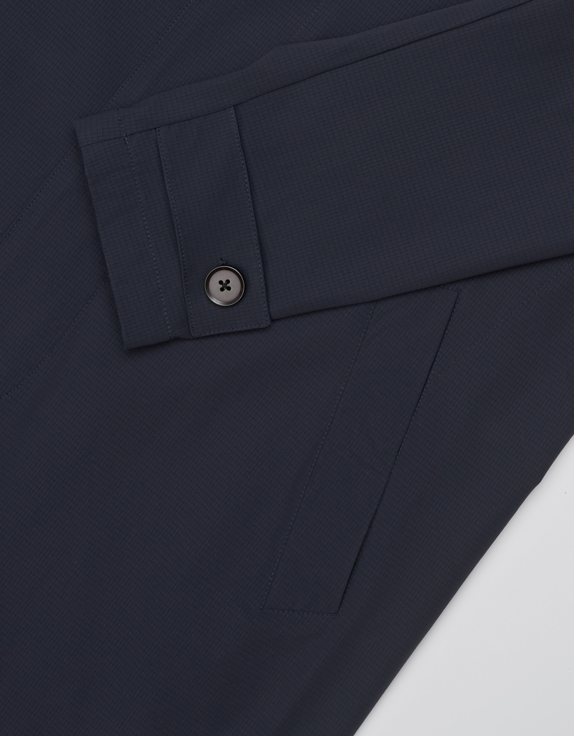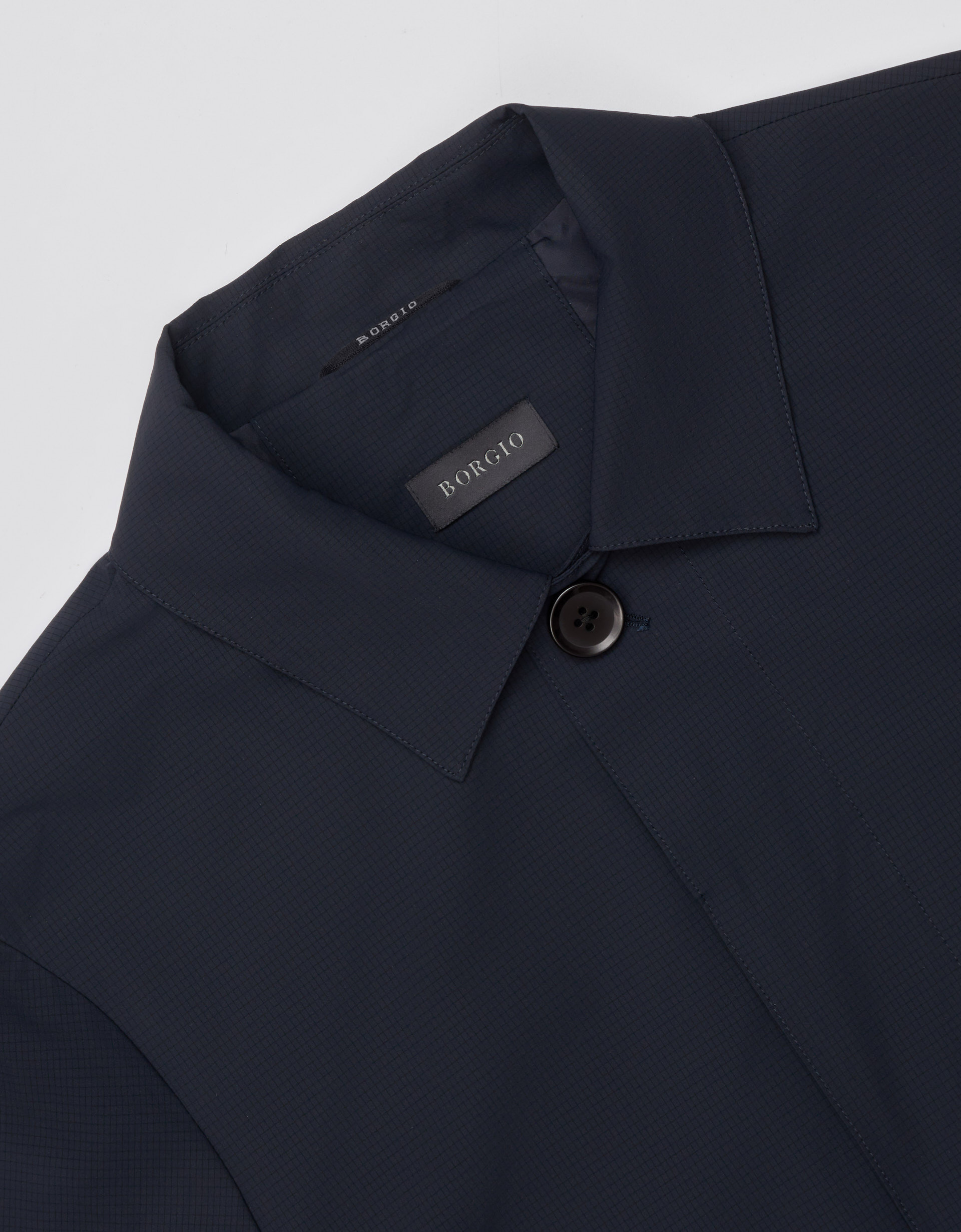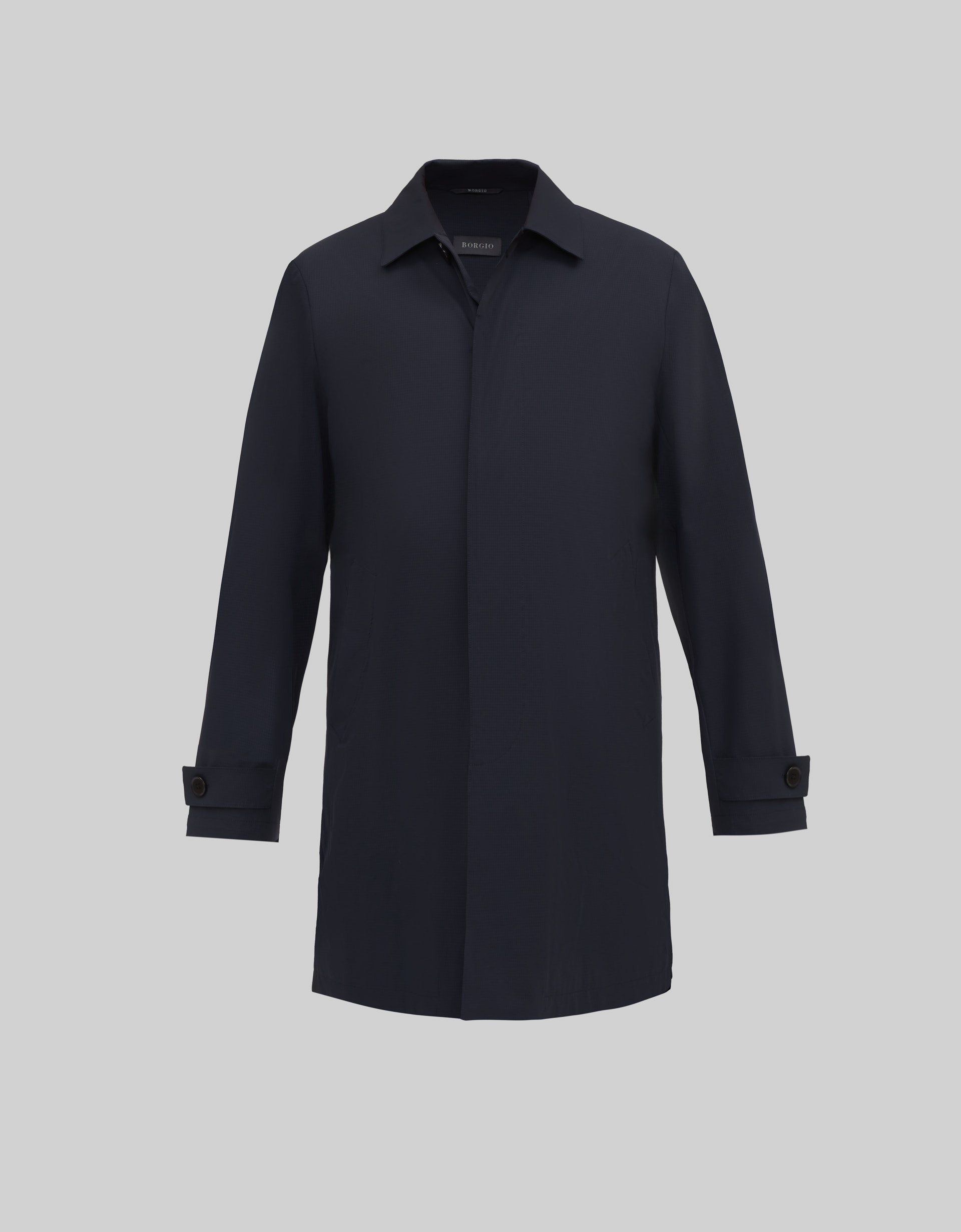 Benevento G to granatowy płaszcz o fasonie car coat, wykonany z technicznej, przepuszczającej powietrze tkaniny o subtelnej strukturze. Nowoczesna interpretacja klasycznego kroju w literę A, wywodzącego się z początku XX wieku, nadaje projektowi z kolekcji SS’26 unikalnego, historycznego sznytu w odświeżonym wydaniu.