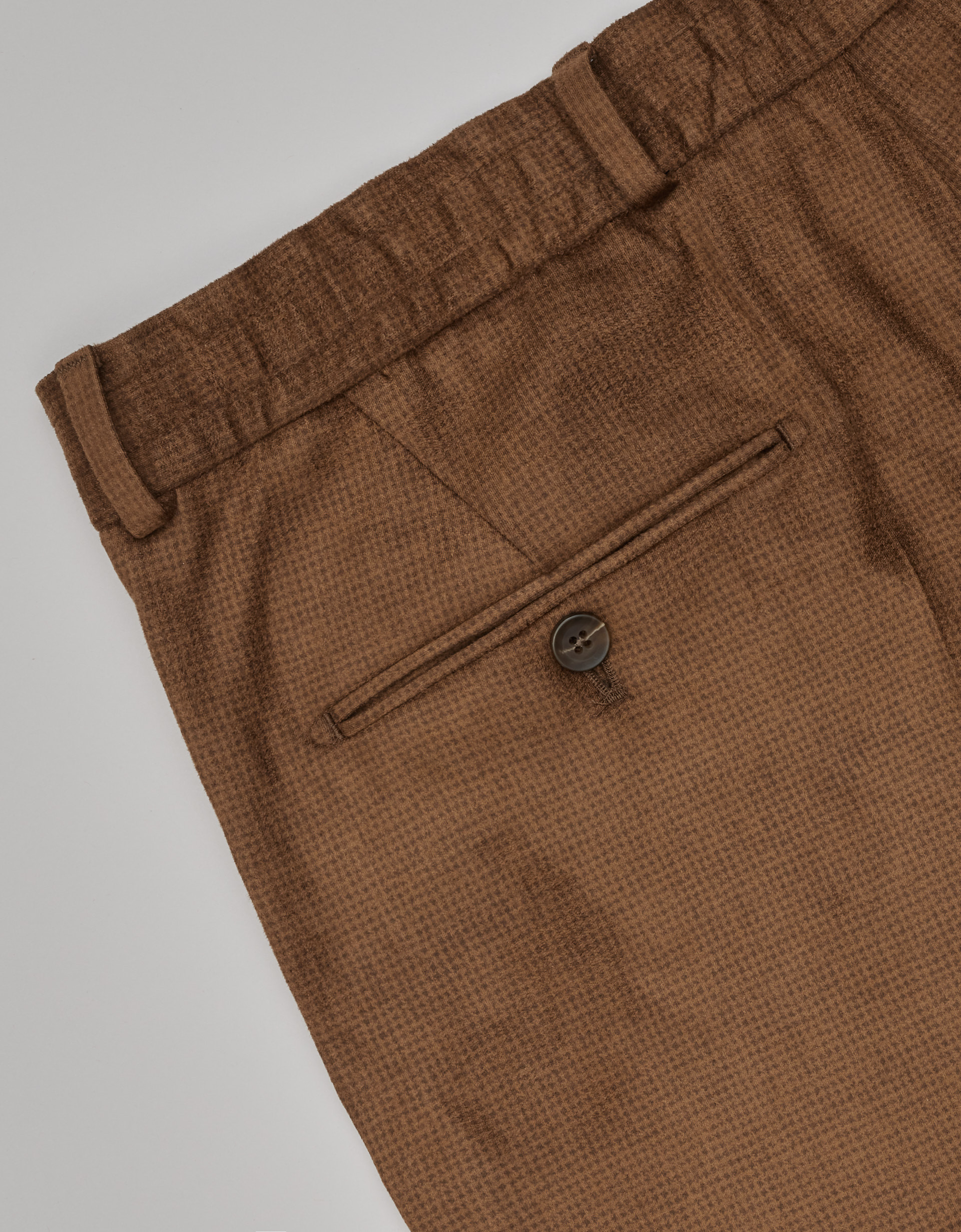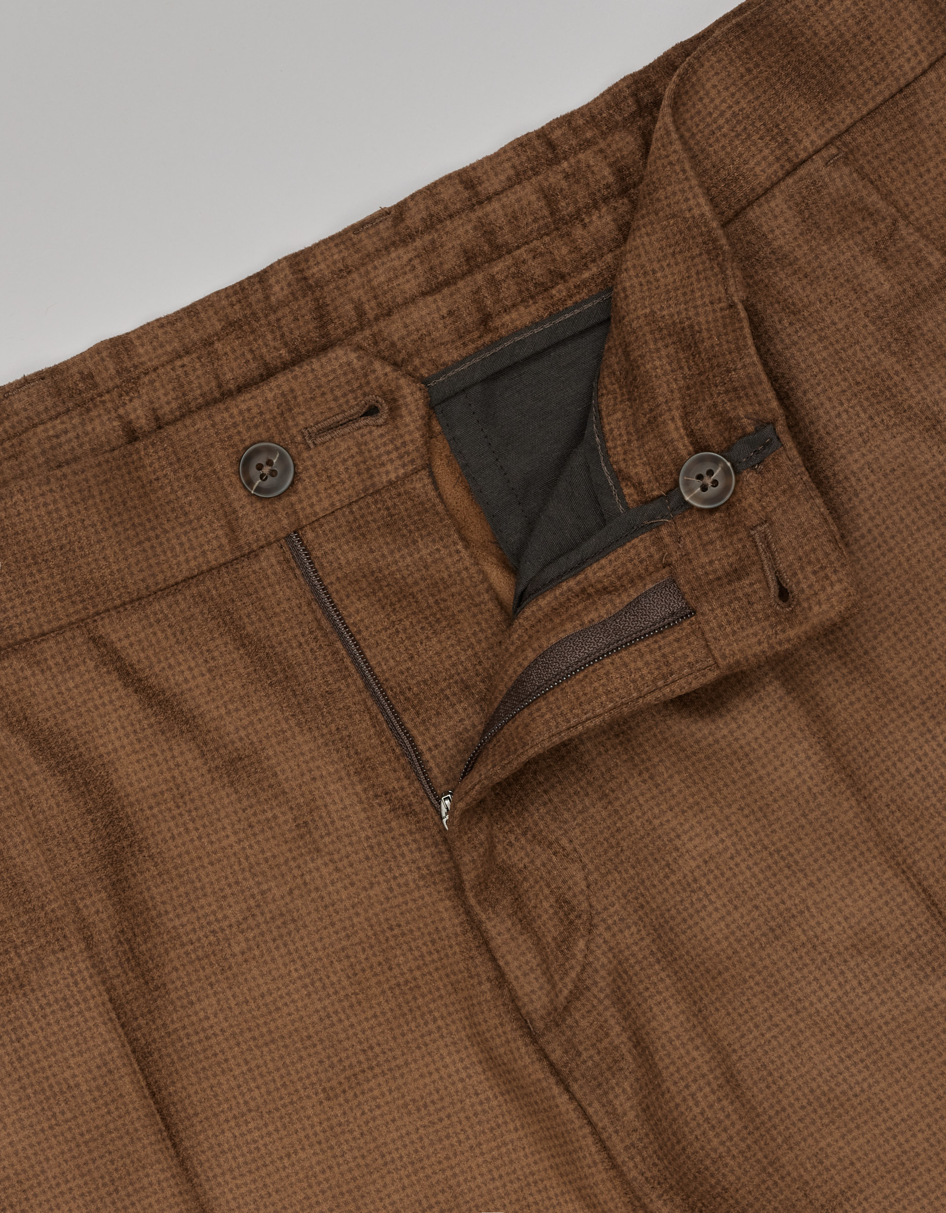 Sueglio to spodnie o kroju Slim Fit, wykonane z miękkiej tkaniny o subtelnym, zamszowym wykończeniu i delikatnym czarnym wzorze pepitki. Model zapinany jest na maskowany zamek błyskawiczny, guzik i haftkę, co zapewnia stabilne i estetyczne wykończenie pasa. Wewnętrzna taśma typu gurt usztywnia konstrukcję i sprawia, że spodnie układają się idealnie, zapobiegając wysuwaniu się koszuli podczas noszenia. Spodnie posiadają dwie kieszenie z przodu oraz dwie proste kieszenie z tyłu, co podkreśla ich ponadczasowy, elegancki charakter. Zwężone nogawki oraz kant nadają całości nowoczesnej linii i optycznie wysmuklają sylwetkę, zachowując równowagę między formalnością a miękką, casualową strukturą tkaniny. Sueglio to model, który doskonale uzupełnia marynarkę z tej samej linii, tworząc stylowy zestaw smart casual o wyjątkowej fakturze i subtelnej, brązowej kolorystyce.